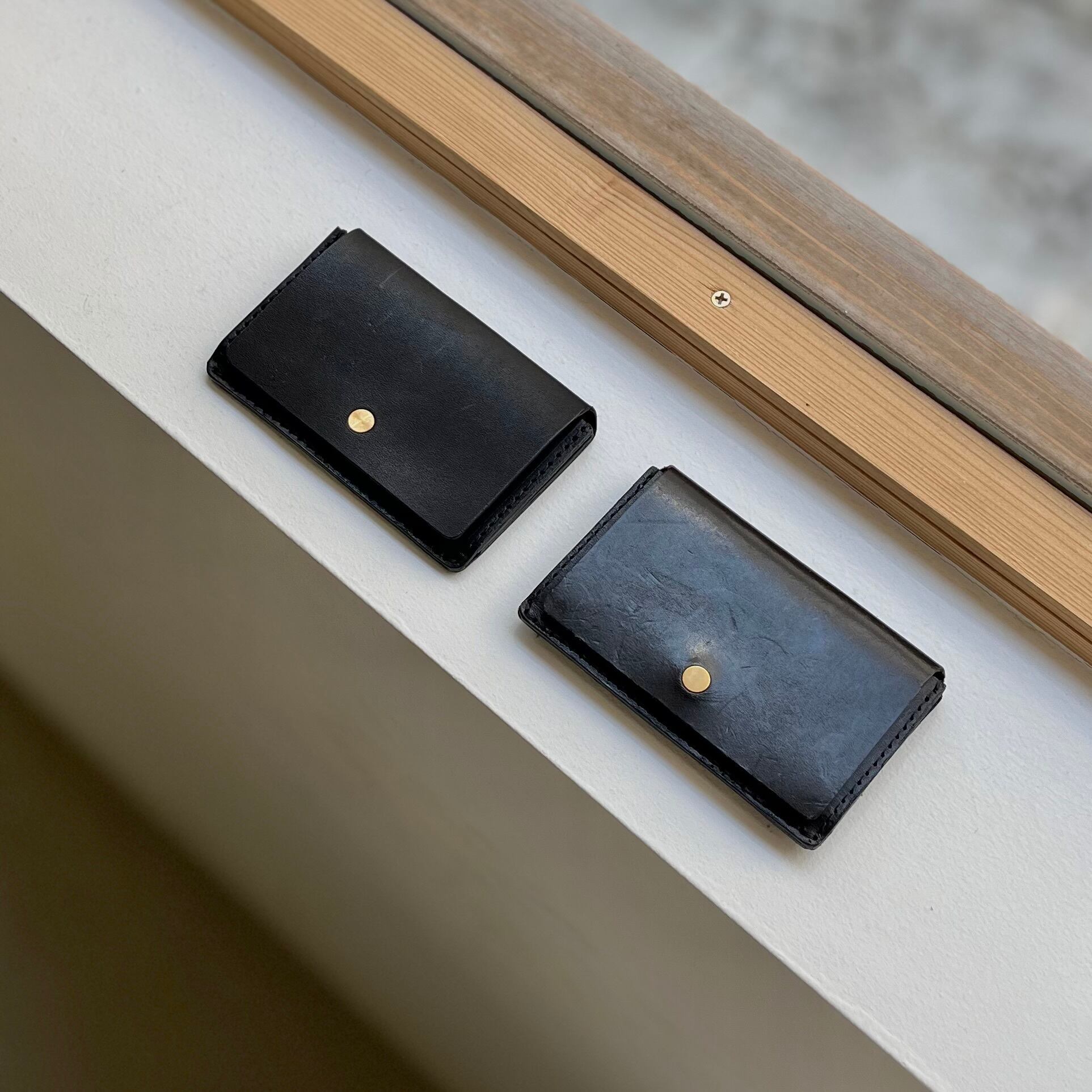 ビジネスシーンにもぴったりの名刺入れ、シンプルながら少しひねりの効いたデザインで、第一印象に差をつけて。