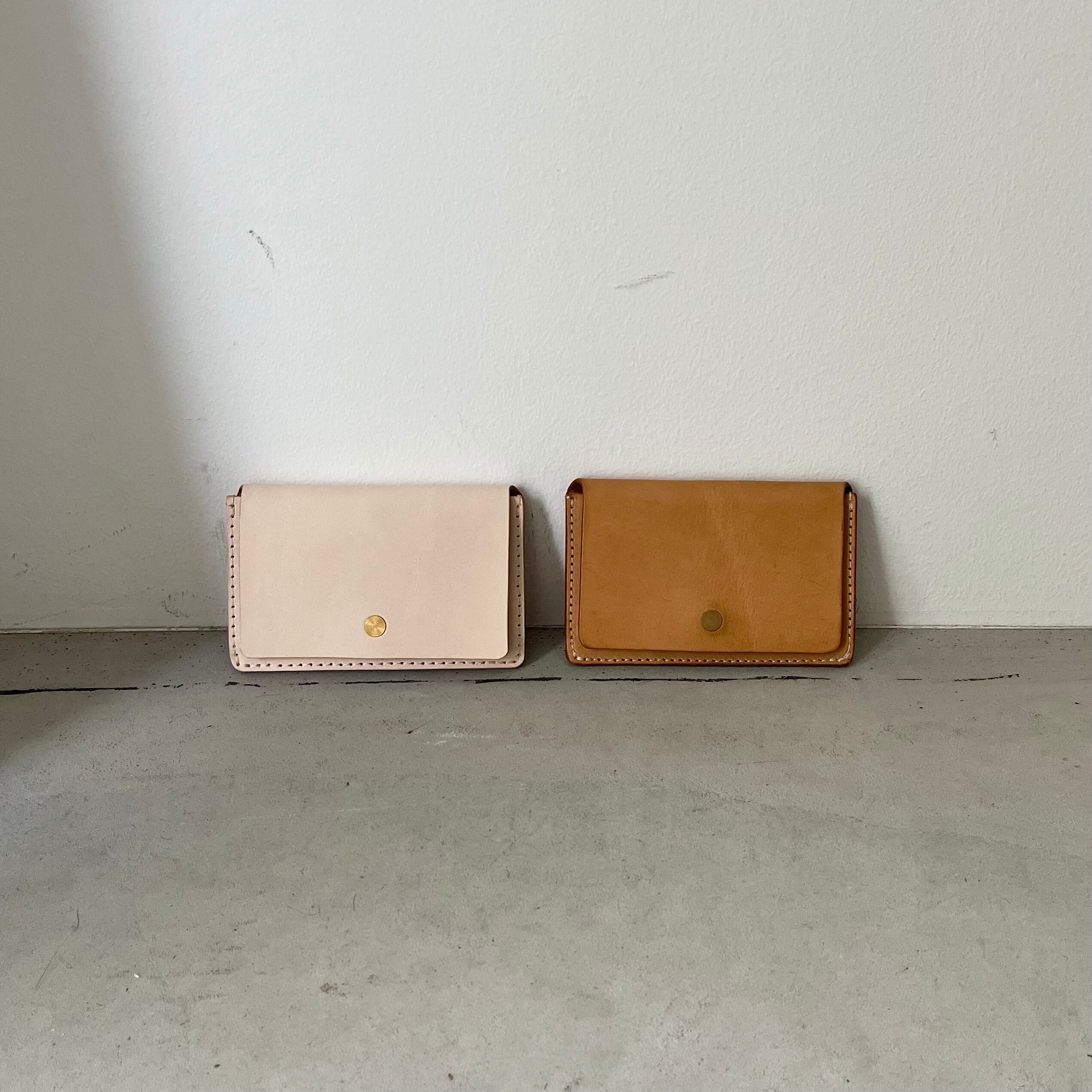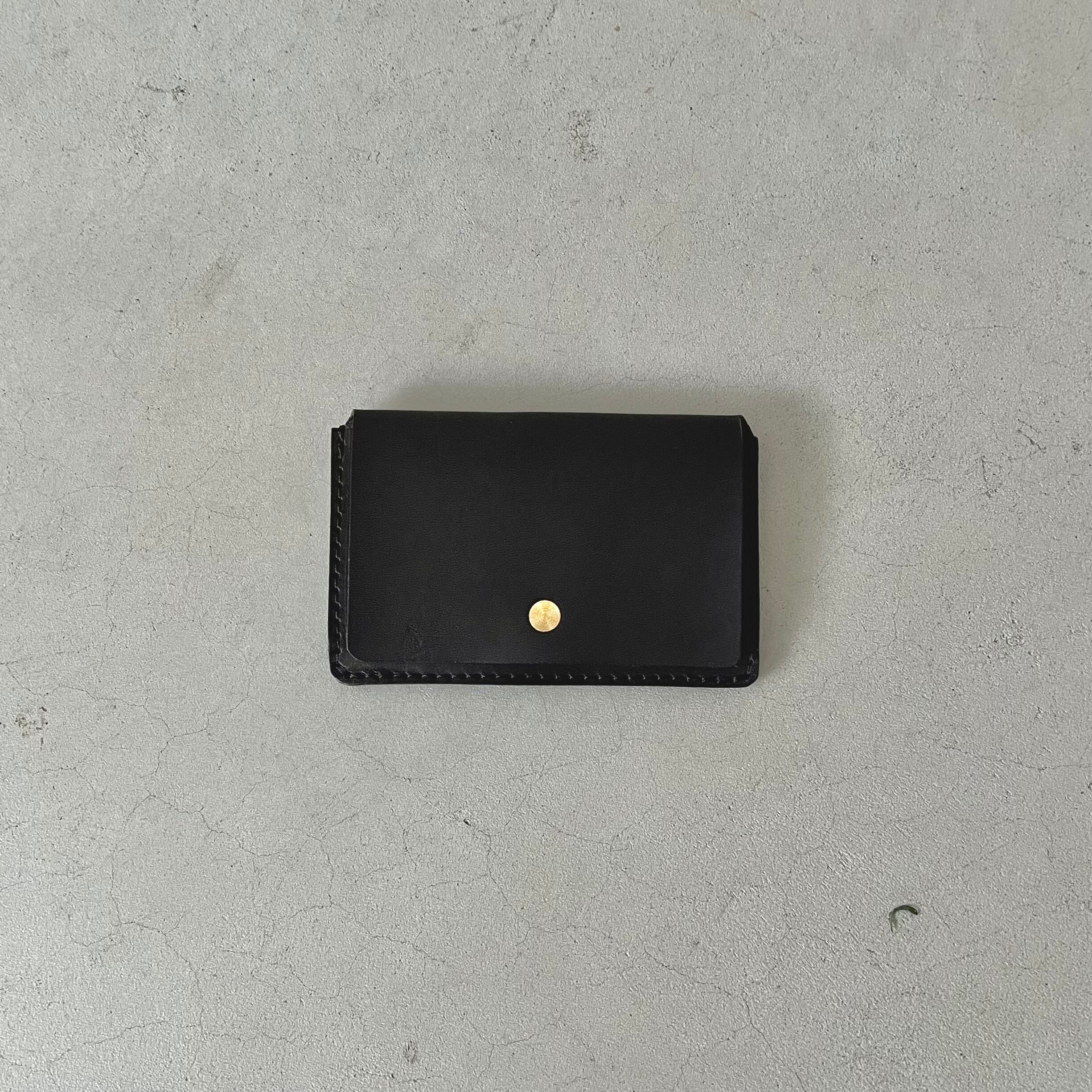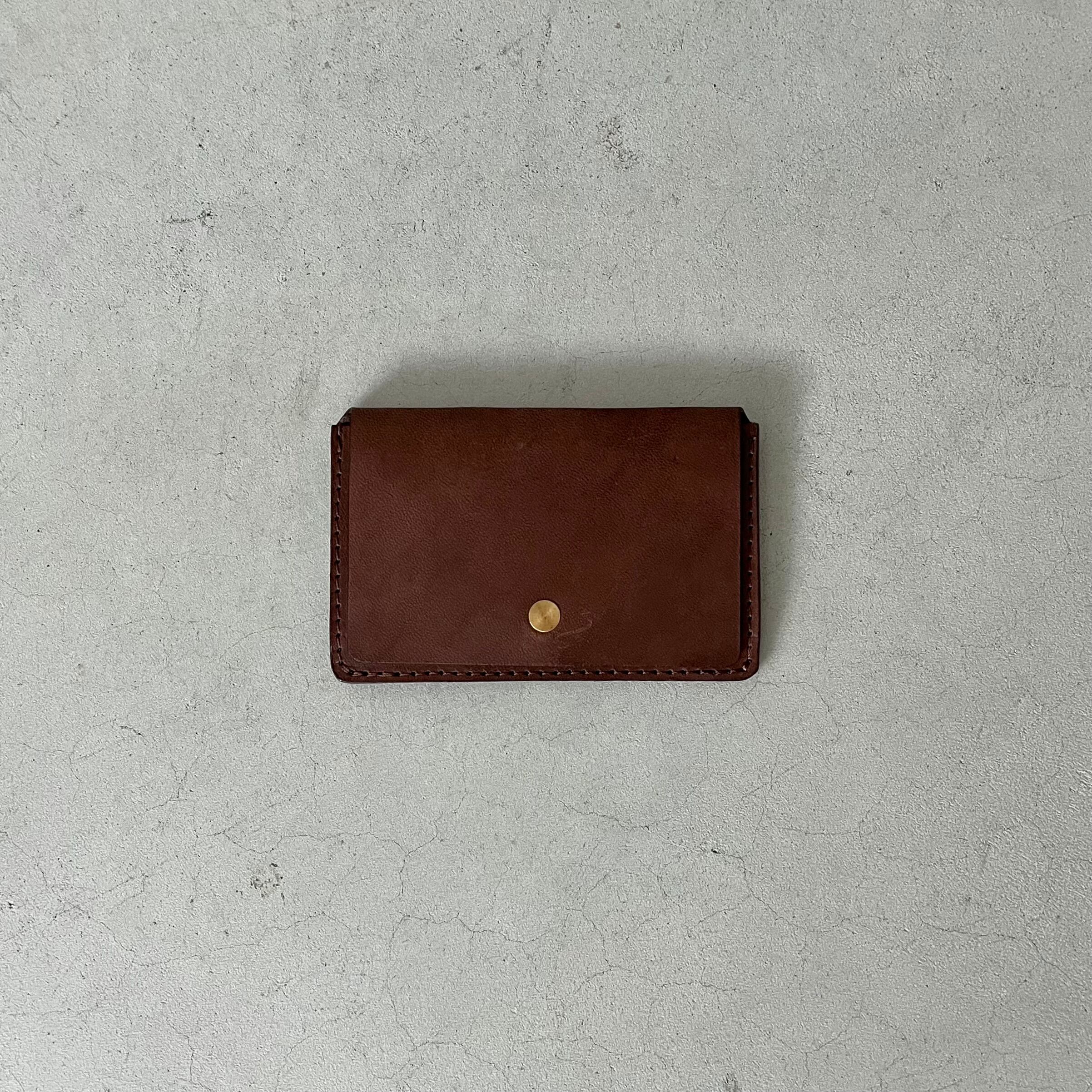 留め具に使用したのはイタリアのPRYM社製真鍮ホック。挽き物ならではの美しいホックで、シンプルなカードケースの顔に。
