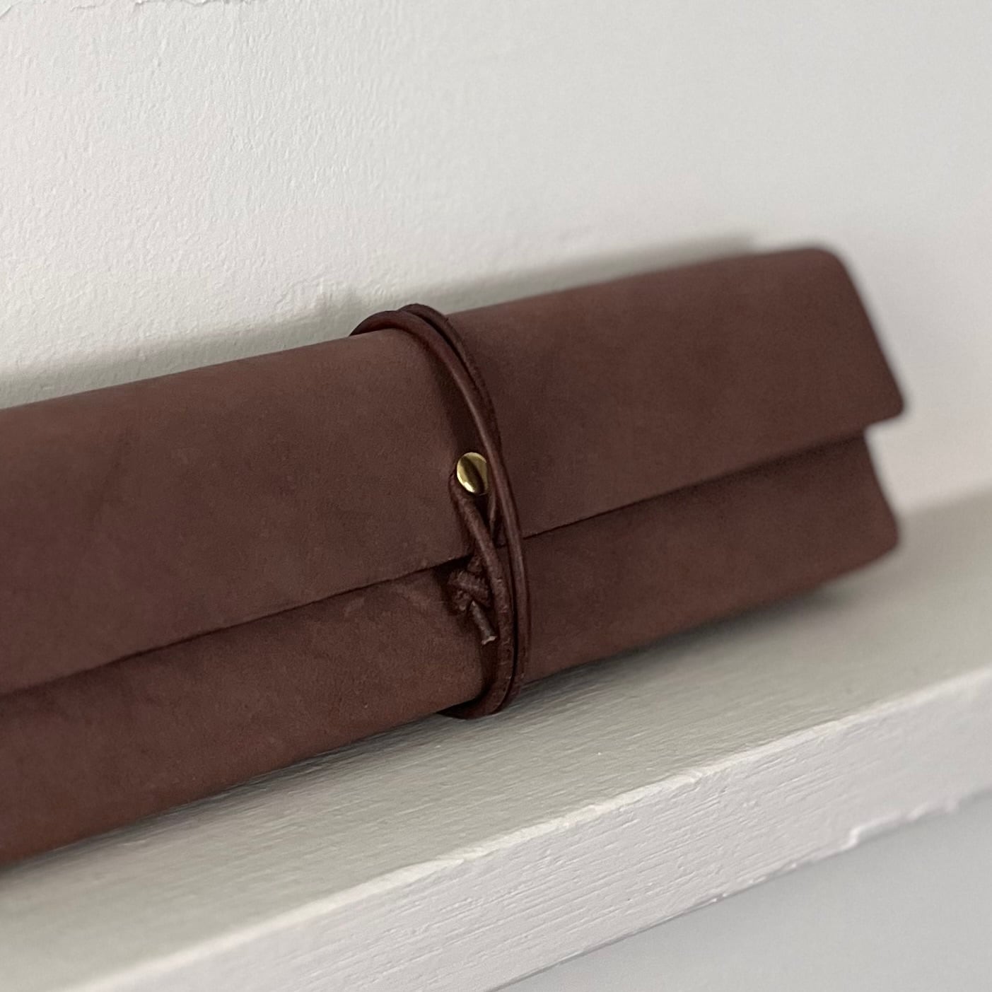 革紐も同じく真鍮のカシメで留めつけ、巻いた革紐の隙間からきらりと柔らかく光るアクセントに。