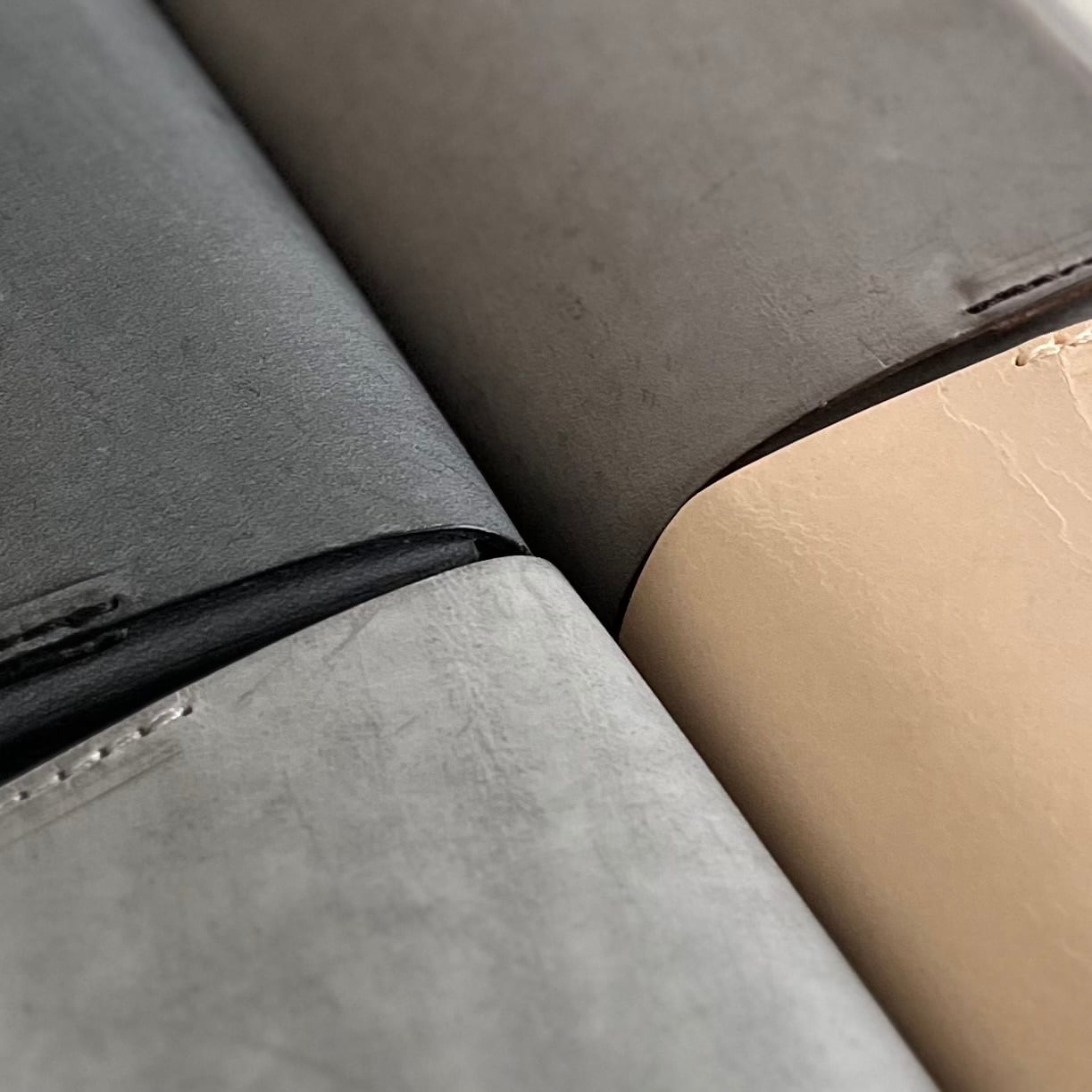 順にクリーム、クラウド、グラファイト、スミクロの経年変化後の姿です。