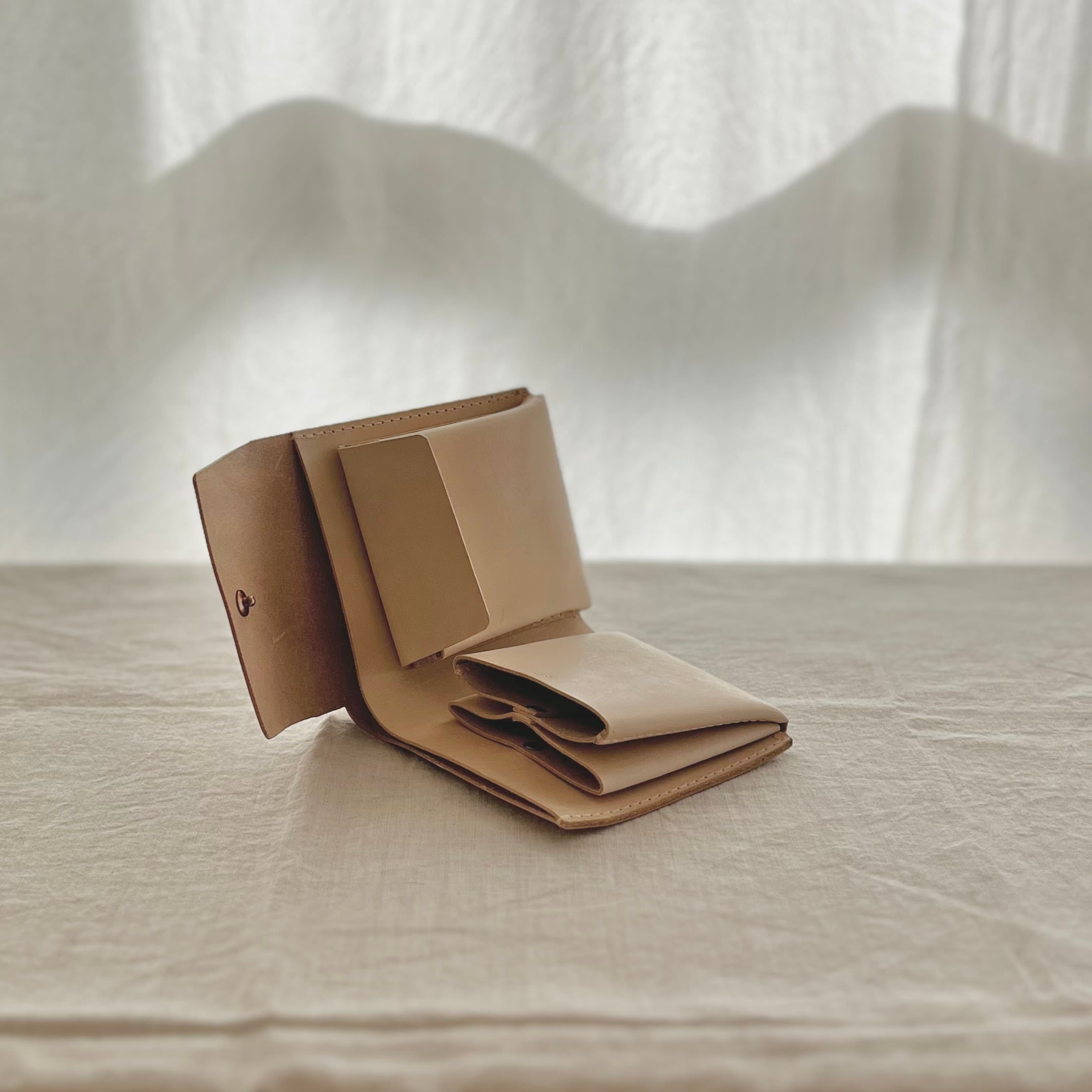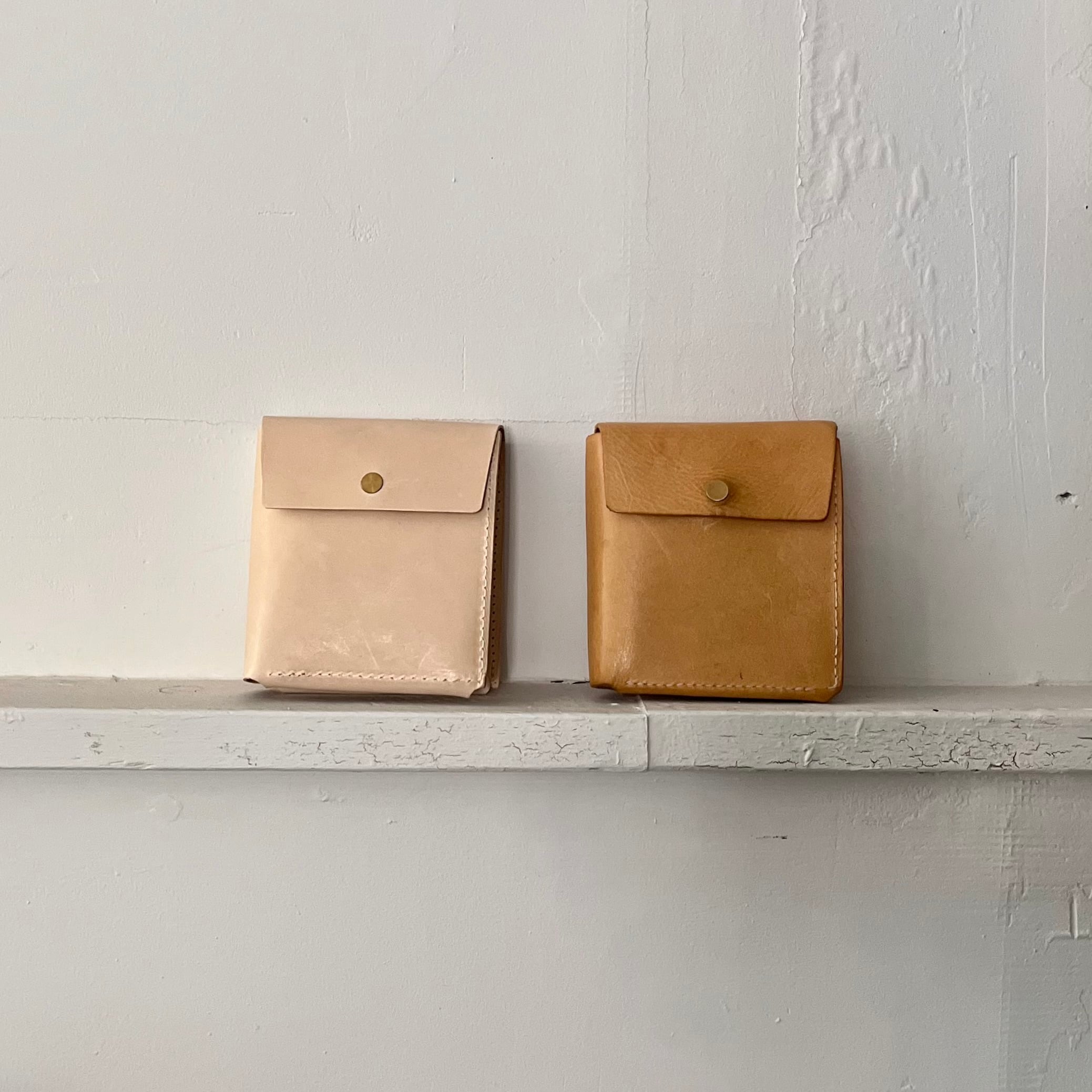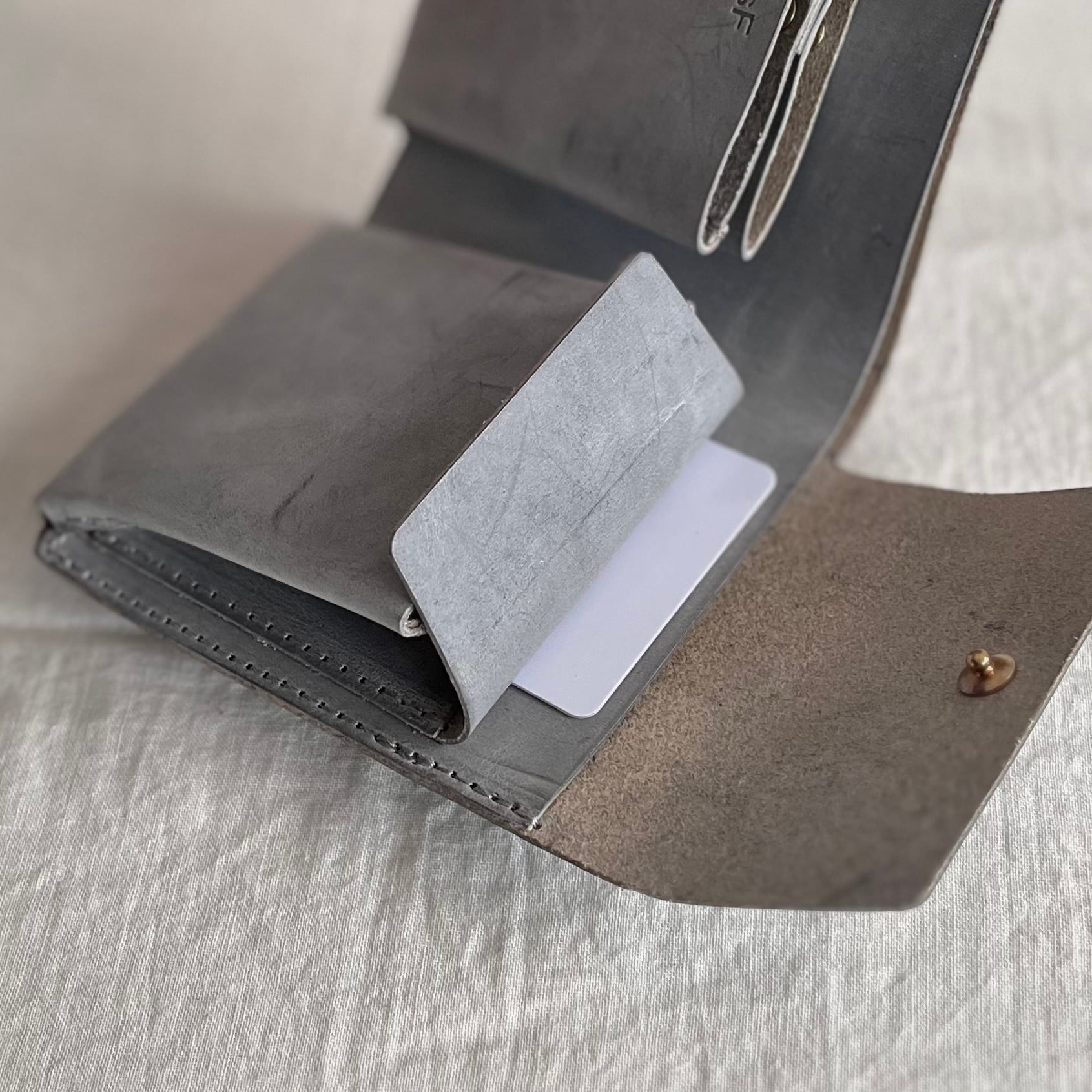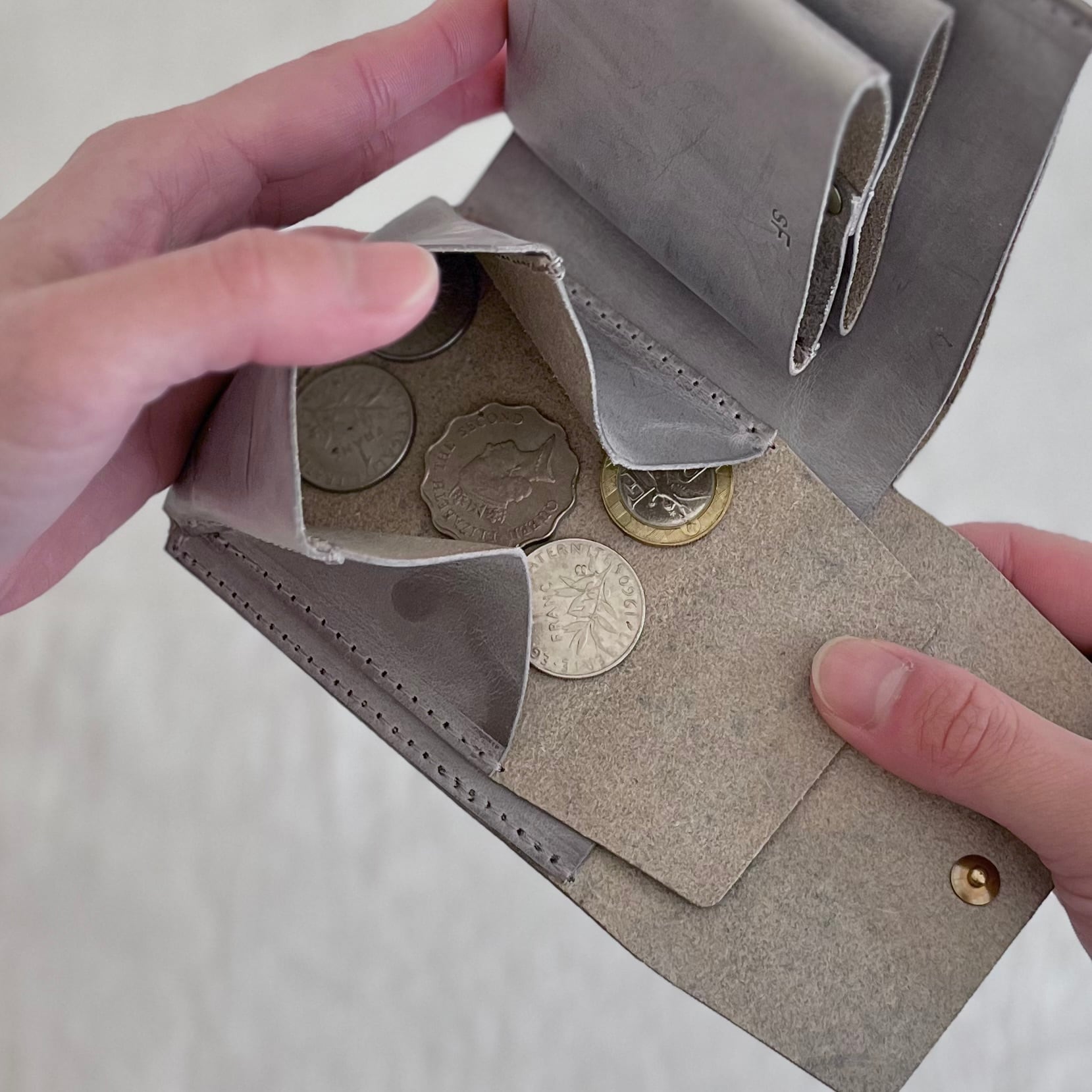 革は薄く漉き、馴染んで折り目の癖が付いたころに、お財布自体が薄くなるよう設計しました。使い込むとコンパクトで薄い二つ折り財布が完成するという算段です。