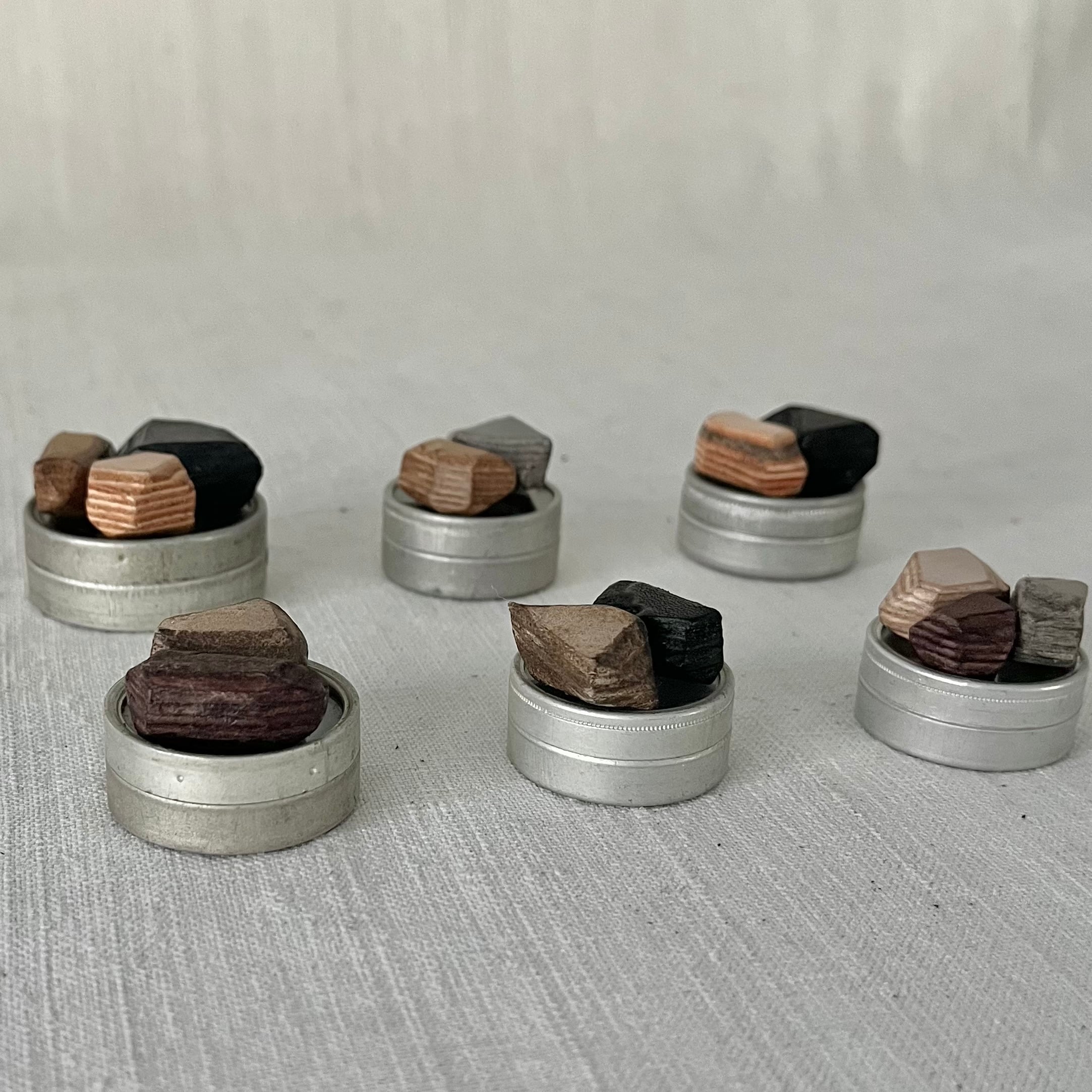 時を経てきた古いものとこれから経年による表情変化を魅せる革、この概念の組み合わせの妙を見出して作ったのが「革の石 標本」です。まだ若くさらっとした革の質感が、古もののように朽ちていく過程がたのしみな作品。